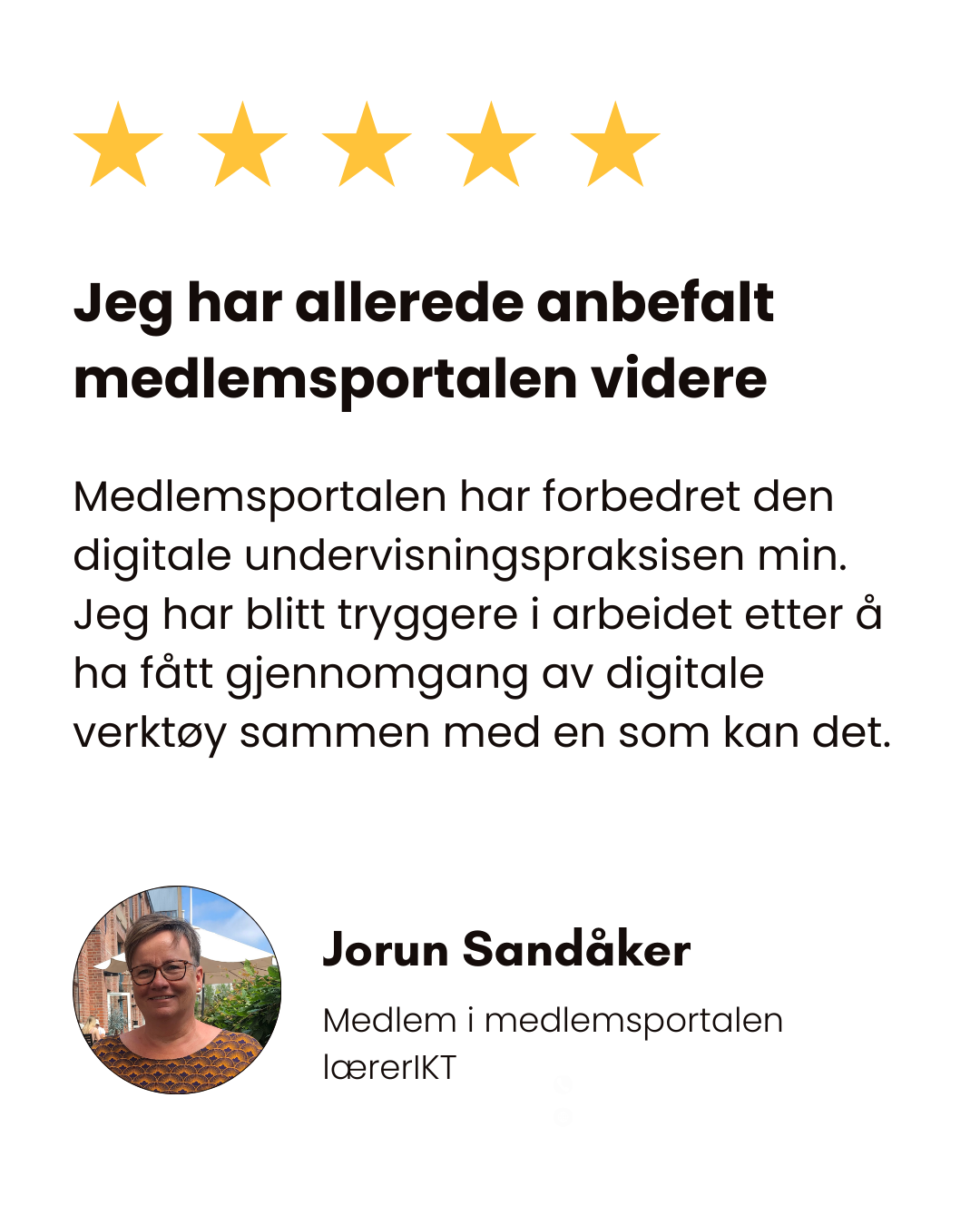 Ved siden av jobben som ungdomsskolelærer driver jeg digiTal SKOLEring og medlemsportalen lærerIKT, hvor jeg har hjulpet tusenvis av lærere med konkrete verktøy og ny inspirasjon.