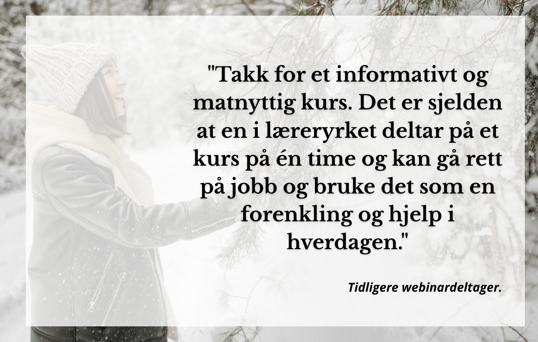 "Takk for et informativt og matnyttig kurs. Det er sjelden at en i læreryrket deltar på et kurs på en time og kan gå rett på jobb og bruke det som en forenkling og hjelp i hverdagen."