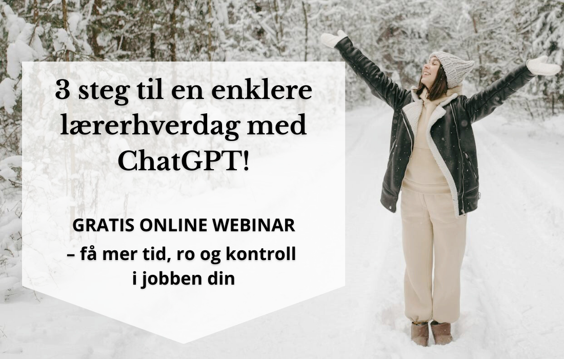 Bli med på dette gratis webinaret, hvor jeg viser deg 3 steg til hvordan du kan bruke ChatGPT til å spare enorme mengder tid – og samtidig få bedre flyt i undervisningen.